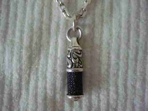黒い部分はエイの皮です。蛇の皮を使った「パイソン」といわれるものは、かなり出回っているらしいのですが、エイを使った「スティングレー」は、あまりないらしく値段も違わないのでこれを選びました。しかし、丸冠を挟んでしまうと皮の継ぎ目の部分が横を向いてしまうので、今回もうひとつ丸冠を挟んでもらいました。トップが大きくチェーンも太いので違和感もそれほどないかな〜と納得してます。