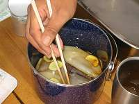 今回はコック長がいるので料理がこっています。イカをさばいて生姜醤油ダレを作り、しっかり漬け込んでます。味 が染み込むまでしばらく寝かせておきます。乾杯の後、とりあえずツマミが必要なのでウインナーを焼いてます。 | ||