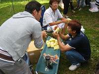 御飯は、お握りにしました。のりぞうさんがコンロで焼いてましたが香ばしくておいしそうです。私は、前日飲み過ぎ た訳ではないですが、食欲がなかったので焼きそばを少し頂き、ひたすらウーロン茶を飲んでました。 | ||
