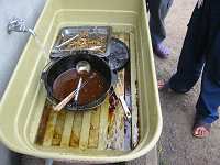 天気がいいので寝袋を干しました。少しずつ片付けを始め、クーラーボックス内も整理しましたが、大量の肉がまだ 残っています。片っ端から角煮に加えて煮込みました。 | ||