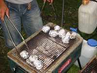 火が弱くなってきたので炭を足そうとしたとき、ジャガイモの存在を思い出しました。皮が黒コゲになってましたが