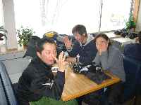 最初は新潟から飛び入り参加のpoyさんと滑っていました。しかし、山頂では吹雪でゆっくり滑れる状態でなく、 1時間も滑らないうちに休憩してました。その十数分後けんたっち達もレストランに入ってきて昼食です。次第に 混んできたのでまた滑り始めたのですが寒いし、ゴーグルは曇るし滑ることが苦痛になり、まるで拷問です。(笑) 3時頃レストランaliceで休憩しました。店内が何か変な様子だったのですが、大道芸が始まりました。こんなこと をやるのは知らなかったので驚きです。結構笑えました。 | ||