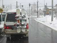 10時50分頃到着しましたが駐車場付近は、修羅場と化してました。大型バスがスリップで駐車していた数台の車 に当たったようです。坂道で停車しスリップで上れなくなっている車もあちこちで見られ渋滞を引き起こしてました。 4駆・スタッドレスを過信するのは危険ですが、万全な装備と雪道運転の知識の必要性を実感しました。けんたっち は、用心の為チェーンを装着しました。 | ||