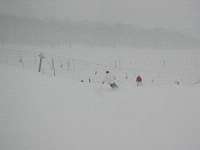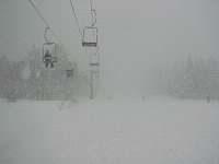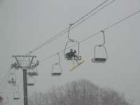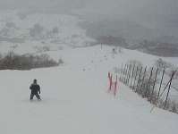 駐車場からコース中腹まで近いので徒歩で移動しました。吹雪いてますが、雪がないよりマシです。とりあえず、 リフト券売り場まで滑りました。 | ||