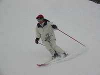 人も少なくゲレンデもいいコンディションです。ルート1に向かいましたが気持ちよく滑っているようです。急斜面でも しっかりと外足に乗っているので安定した滑りを見せていますが・・・。 | ||