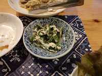 天気が良ければバーベキューの予定でしたが、雨で中止です。残念ですがテーブルを囲んでメンバーと近くで 色々と話ができたのでよかったです。普段あまり野菜を摂らないので、こごみのマヨネーズ和えや茸のソテーが おいしかったです。 | ||