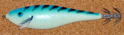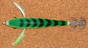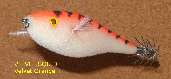 '98年登場のカウントダウンのボディにイカ針をつけただけのスクイッド(SQ)とは違い、専用ボディで表面にビロードのようなふわふわしたコーティングを施してあります。 そういえば、フィッシングショーで蓄光だか光るボディだかだと説明を聞いた気がする…。 ゴソゴソ(確認中)…はい、ボディは蓄光になっています。ヴェルヴェット素材から剥き出しになったスイベルの固定部分と、餌木用フックの固定部分は特に目立って光ります。 形はイカ釣りのスッテのようなちょっと頭回りがファットなデザインになっていて、餌木によくあるボディサイドのヒゲも立派なのが付いています。 (俯瞰写真参照)