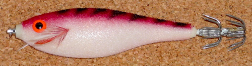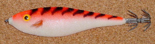 もちろんフックは餌木用2段フックです。しかし、単独でキャストして使う餌木とは違い、別におもりをセットして浮かして使う魚型スッテの一種と思われます。 フィッシングショーでのデコレーション(右の写真もその時のPOPの一つ)の力の入れ方とは裏腹に、短期間で廃版となった上にほとんど市場に出回らなかったのではないかと思われるほどに私の周りでは姿を見なかった、マボロシのラパラの一つです。 | |||||