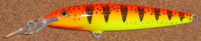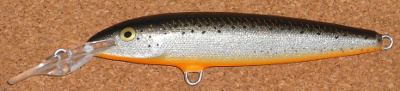 丸々太ったイワシのような形状の硬質ウッド製ボディは、普通のウッドルアーのようなウェイトが入っていないとのことです。 性能的にみると、F-MAGより重く、CD-MAGより軽いボディは、左の写真のようにスプーンみたいな大きなプラ製リップを持っていて、左右に大きくボディを振りそうです。 本来トローリングを主に開発されたようですが、キャスティングにもお勧めということで 3.5〜5.4mも潜るビッグボディは、ショアでもオフショアでも使えそうですね! しかし、対象魚の絞り込みが難しかったのか、あまり騒がれることなく消えていきました。 |