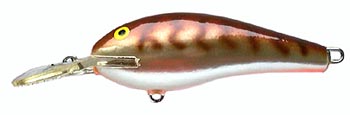 日本では'77年に発売開始されたラパラです。 中型のクランクベイトで、丸みがありながらすらっとしたボディと、クランクのくせにノンラトルのバルサボディが特徴のルアーです。 バルサ特有といわれるきびきびした動きで感じがいいのですが、割と軽めなのであまり使ってなかったりします(^^;)。 元々これがラパラのクランクのメインモデルだったのが、プラスティックのラトリンモデルの登場で少し影が薄くなり、更にDTシリーズの登場で影を潜め、遂に廃版になったモデルではありますが、今でも十分な戦闘力を秘めています。 バルサ製で丸っこいボディの割には結構潜るので(7センチモデルで5メートルと書いてあるが・・・?)使い道は広いルアーです。 一説には、管理釣り場のマスにも効果有りとか!? 一時期の流通量が多かったため、今でも旧カラーが在庫販売されているものもあります。 なお、初期絶版カラーのシャッド(SD 下記カラーチャート参照)は、現在ある魚模様を印刷したものではなく、パールボディで黒い背中、オレンジのおなかというカラーリングで、SHAD RAPのパールホワイトスペシャルのように、側線上に黒点があるものです。 また、旧カラーのCWはパールボディに茶色のtigerカラーでしたが、ニューカラーではザリガニみたいな模様入りになっています。 なお、発売時期等は定かではありませんが、フロントフックがシングルフック、リアフックの代わりに赤い小さなプラ板の付いた「ウィードレスモデル」がありましたが、大変レアです。 | |||||