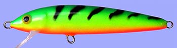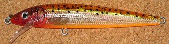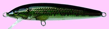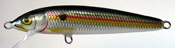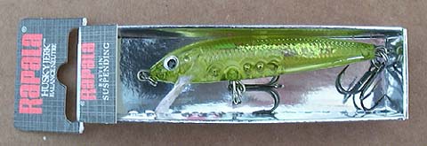 もともとRaPaLaには「HUSKY」という13センチほどのジャークベイトがあったんですが、RaPaLaのミノーには珍しくラトル入りプラスティックルアーとして作られた「HUSKY JERK」は、名前の通り完全にジャークベイトとして作成されたって感じです。 サスペンドモデルではありますが、他のフローティングやカウントダウンとどこが違うかといえば、ジャークしたときのきびきびした動きかな? ジャークしたロッドを止めると同時にぴたっとステイしたルアーに、バスがきらっと鱗を光らせ喰い付いてくる瞬間はなかなか感動的で、さすがは「JERK」と名前が付いただけのことはあると感じます(^^)。 あと、ホイル張りに見えるカラーが多かったのも特徴ですが、実はこれ、「銀」蒸着ボディにカラーを塗った物なんですね。 なかなか凝った作りですが、耐水性の問題や経年劣化が激しく、塗装が白濁したり金色っぽく変色したりしやすいです。 上の写真は、8センチモデル(HJ-8)のジャパンスペシアル アユカラーです。 最初は12、14pモデルだけでしたが、すぐに8、10pモデルが追加され、'99より6pモデルも登場しました。 シーバス、ブラックバス、メッキ、根魚等々、いろいろな魚種に対応できるルアーになっています。 なお、6、8、10pモデルは二つのフック。12、14センチモデルは三つのフックが付いています。 また、ソルトウォーターハスキージャーク(SHJ)という名前で、錆びにくい海対応フックになっているモデルも出ていましたが、いつ出ていつ消えたかいまいちしっかりした情報がありませんので調査中です。 2003年には、透明ボディのグラスカラーシリーズが登場し、こちらもなかなかの人気を博しております。 2008年には村田プロデュースカラーがHJ6に登場しました。 更に冬には、HJ6に G,GPCL,TSDが追加になりました。 2017年1月に復活宣言され新カラーが登場しました。いつの間に廃盤になってたんだろう? ただし、6pモデルは更に後年の復活となりました。 | |||||