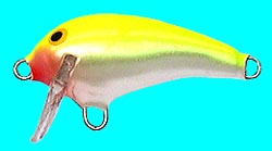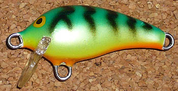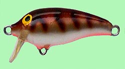 ほんとに丸くてちっちゃくて愛嬌もあって可愛いルアーです。 こんなに小さいのにバルサ製で、ラトルは入ってなくて、普通のリトリーブで60センチから1.5メートルくらい潜ると書いてありますが、実はシンキングプラグなので放っておくとどんどん沈みますし、それでも小さいために重量がないのでスピニングタックル向けであります。 下のカラーチャートを一見してわかるとおり、あまりにも小さいバルサプラグなので、個々の出来に結構差があり、丸いヤツやつぶれかかったようなヤツもあります。 特に、各アイ部分のワイヤの形はてんでバラバラですネ(^^;)。 私は良くPEラインで使いますが、スパイダーワイヤーブレード等のしなやかなラインを使うとフックに絡みやすいという欠点があります。 しかし、ボディが震えるというよりほとんどローリングに近いアクションは、「よくぞここまで動く!」と感心するほどです。 時として爆発するルアーでして、岐阜県東濃地方の溜池で誰も釣れてない中、こいつのファイアタイガーカラーで3連チャンして、地元の子供にあこがれのまなざしで見られたことがあります(^^)。 私のオカッパリファイナルウェポンですね。 ところでこのMFR、2002年頃からの管理釣場ブームで結構脚光を浴び、2004年には村田基氏プロデュースの管釣りカラーがCD3,F3と共に登場しました(後にCD1でも登場)。 更には海でのルアーフィッシング、メバルやアジ狙いにも活躍しています。 ちっちゃくて重くて良く動くから、結構使いやすいのでしょうね。 おかげでちょこちょこと新色が出てきています。 しかし、なぜかMFR3のHajimeMurataSelectionはすぐ無くなってしまいました・・・・・ 何でだろう(^^;)。 でもって、2011年新春には再び村田プロデュースの「カモフラージュカラー」が登場しました! 見つけたら即買いしないとまた無くなるかも!? | |||||