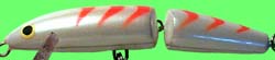 ジャパンスペシアルのなかでも結構人気のあるカラーです。 パールホワイトを基調に、赤色のきついオレンジで背中に単調な模様を描いてあります。 模様としては非常にシンプルなんですが、とっても綺麗ですね。 ジャパンスペシアルに多いパールホワイト基調は海用に作られているようですが、このコンスタン・ギーゴもやはり海での使用が多いようで、ラパラシーバスダービーでも上位入賞者の中にこのカラーを使っている肩代わりとありますね。 そういえば、昨年の学研つりトップには、'99モデルとしてコンスタン・ギーゴに模様がピンクとチャートリュースのカラーが加わるとなっていましたが、今のところまだ見たことがないです。 | |||