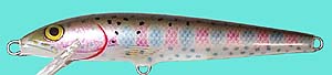 このカラーも、割と以前からあるカラーですね。 とりあえず'84年以前から存在していることは確認しています。 さてさて、カラーについては名前の通り「ニジマス」をイメージしたものと思われますが、ちょっとパールっぽい光り系の下地に、背中に茶色っぽい深緑を吹き、青メッシュのパーマークを入れ、ニジマスにある特徴的な赤いボディラインをやはりメッシュで入れ、背中方面に黒、おなか方面に灰青の点を入れてあります。 背中の深緑以外は印刷っぽいですね。 このカラーについては、元のニジマスがミノー系ですから、やっぱりミノー系のルアーにのみそのカラーが存在しています。 私にとっては結構思い入れのあるカラーで、フローティングジョインテドは池原で初ラパラフィッシュを捕りましたし、フローティング5センチは利賀でRaPaLa初渓流魚のイワナをゲットした時もやはりニジマスカラーでした(^^)。 アメリカでは、ビッグレイクでバスの餌にニジマスの稚魚を放流しているなんて話も聞きますので、バスのベイトとしてニジマスが一般的なのかもしれませんが、日本ではあまりニジマスをベイトと考えることが少ないせいかニジマスカラーって人気無いのか、あまり使っている人を見かけませんね。 でも、実は結構何処でも有効なカラーだと思いますので、是非タックルボックスにお気に入りモデルのRTカラーを忍ばせてください! | |||