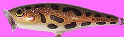 これは'99年ニューモデル、スキッターポップで新しくデビューしたカラーです。 私の記憶の中にはない不思議なカラーで、はじめてみたときは「牛?」って思っちゃいました(^^;)。 でも、某氏は見てすぐフロッグって言ったから、珍しいわけではないのかな? そういえば、アーボガストとかでは、黒いブチが付いてるカラーは一般的にフロッグって言うんでしたっけ。 パールホワイトの上に、茶金色を背中にかけて吹き、体側に滲みシミのような赤いラインが入っています。 で、とどめに黒いブチ。こいつは効いてます(^^;)。 とりあえず今のところスキッターポップにしか設定されていませんが、フロッグカラーだとするとRaPaLaのラインナップでは他に使えそうなルアーがないかな? しかし、このカラーの略符号『F』っていうんですけど、これってフローティングラパラの『F』と同じなんで混同しちゃうと困りますね(^^;)。 | |||