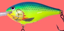 う゛ーむ、また難しいカラーですね。これは(^^;)。 カラー名称である『Parrot』とは『オウム 人の考えを受け売りする人』って意味のようですが、鳥のオウムのようにド派手なカラーだって事でしょうか? イエローグリーンをベースに、グリーンで背中を吹き、エラからは赤いひらひらが飛び出て描かれています。 しかもリップの下にはオレンジが吹いてあるし。エラの前にはシルバーのラインで変な模様が描かれていて、同じシルバーで胸ビレが描かれています。 ・・・とかいいながら、実は正当チャート系のルアーかな?等と思ったりして(^^;)。 今のところまだこのカラーでの釣果がないのですが、私の持っているリストラップはサイズが大きいので、そのマイナスを引いてやっても、実は結構釣れそうに思っているカラーだったりします。 | |||