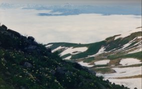 【雲の峰 いくつくずれて 月の山】芭蕉 マイクロバス道を湯殿山神社まで歩き、ここから登山道に入る。早朝の湯殿山神社入口は堅く閉ざされていた。ここから胸を突くような急登が始まる。沢のほとりにはリュウキンカが咲く。岩角を踏むきつい登りも、整備は行き届いて安心して歩くことができる。長い鉄梯子をふたつ越えると厳しい急坂も終り、樹林の切り開きから湯殿山の三角錐が目前にあった。 緩くなった道を少し行くと明るく開けた草原状の一画に、 薬草を煎じて飲ませてくれる施薬小屋が建っていたたが、人の気配はなかった。 この先から雪渓があらわれる。いくたびか雪渓を横切り、左手には品倉尾根を目にしながら登りつづける。シラ ネアオイを始めて目にした。薄紫の花弁が品格を感 じる。白装束の人々が、見るからに足取りもおぼつかなく下って行った。 志津ロコースと合っする牛首に登りついてひと息入れる。前方に大きな月山が迫って見える。姥ケ岳と月山に挟まれた広い谷は豊富な残雪で、夏スキーのメッカとして知られる。 登山道沿いにヒナウスユキソウの大群落を見る。ミヤマキンバイ・ハクサンイチゲ・ヨツバシオガマ・・・本格的な高山植物の出現である。雪渓の縁をかすめるようにつけられた草原の平坦な道は、高山植物を道連れのこころ和むプロムナードであった。 ときに雪渓を横切り、あるいは雪上を直登して岩石の塁々とした急登にさしかかり、後方を振り返ると谷に広がる雪渓、そして遥か雲上に浮かぶ朝日連峰。なお目を擬らせば飯豊連峰まで望める。ブラボー。岩塊の隙間には、丹念に植えこんだように花々が飾っている。 石段を登るように最後の急登を詰めたところが鍛冶小屋である。立ち寄らずに通過して、あと僅か岩を乗り越えるように登るとそこが月山山項であった。なだらかに広がった頂上部は沢山の花が足元を埋めている。何十人という大勢の登山者が広い頂上に散らばって、花を愛でたり写真を撮ったり、またのんびりと憩いの時を過ごしているグループ もある。 敷石参道の先、わずかに小高くなったところに社が建ってここが最高点である。参拝しようとすると呼び止められ、『ここでおはらいを受けろ』という。お金がいるのかと聞くと300円だという。私は財布を自動車の中に置いてきて、ここには一円も持っていないというと、それならここからは入ってはいけない、きまりだきからと融通のきかない話で、最高点に立つことはできなかった。うきうきした気分が損なわれ、ここに長居している気が失せてしまった。 裏側に回って見ると羽黒山側の八合目からの登山者が、雪田の上を一列につながって登って来るのが見 える。いい姿をした鳥海山が望める。蔵王連峰も雲海の上にあった。朝日連峰、飯豊連峰、吾妻連峰と雲上につづく峰々の眺望はハイライトであった。 山頂を後にして、施薬小屋から急な下りにかかり、二つ目の鉄梯子を後ろ向きに降 りているとき、私を呼ぶ声に下を見ると妻が居る。自動車で待つと言っていたのに、ここまで登ってきたのだ。施薬小屋まで登ればコイワカガミの群落、ミズバショウもある。せっかくここまで頑張って登ってきたのだから、もう一度私もそこまで一緒に戻ることにした。雪渓や花に妻は大いに満足。ミズバショウの中で写真を撮ったりしていると、あっという間にあたりはガスに閉ざされてしまった。 鶴岡市から日本海沿いに新潟へ南下し、 関越自動車道をひた走って東京へ9時間余のドライブはさすがうんざりであった。 |