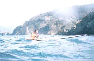 聖子は自動車で一足先にPIER101に戻り、波の高くなった海を残った4人で、漕いで返ることにする。船出すると、うねりが高くなったのが実感できた。南西の風がうねりを大きく増幅させる。斜め後方の風をうけて、飛ぶように船が進んだ。
