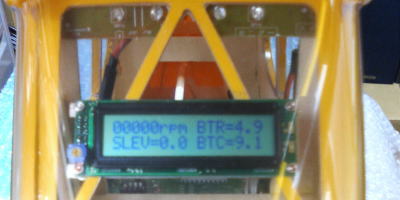 |  | Cubに搭載した液晶表示器 rpm : エンジン回転数 SLEV : 回転センサ読取レベル BTR : 受信機バッテリ電圧 BTC : 制御回路用バッテリ電圧 電圧値はA/D変換してデジタル表示します | ||||||||||||