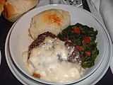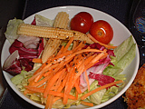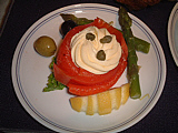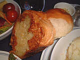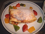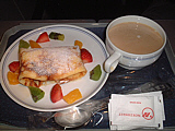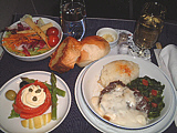 | 山盛りのサーモン。ま、結構美味しかったかも | サラダ。和風ドレッシングなので旨かった(笑) | メインは牛ステーキ、マスタードクリーム。肉が堅い・・・ | パン。手前のガーリックトーストが旨かった | ミルクティを頼んだのに、出てきたのはコーヒー(汗) | デザートはフルーツクレープ。ま、普通かな? |