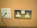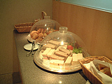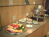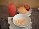 | 朝なのでサンドウィッチやパンが豊富にあります | フルーツになんとお粥まで用意されています!! | PCコーナー。市内電話はもちろん無料です | どこでも同じような電話ですねぇ〜(笑) | プラグがBFしかないのにはちょっとオドロキかも〜 | 私の朝食?です(笑) お粥は美味しかったよ! |