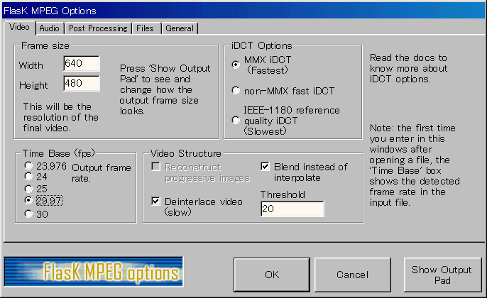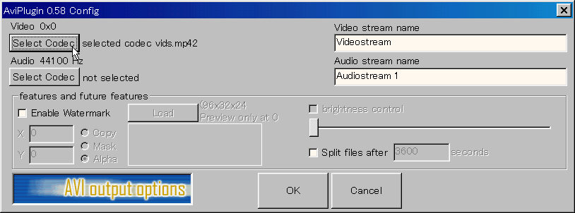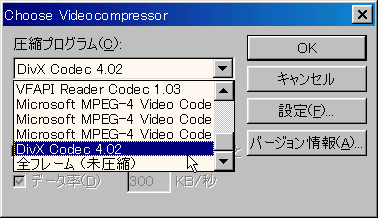 映像の設定、Select Codec を開き DivX Codec 4.02 を指定、