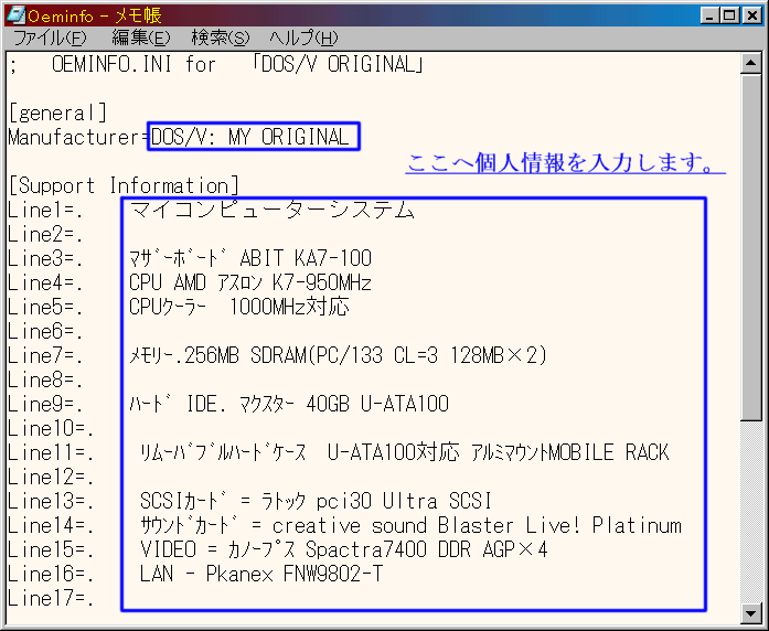 上記項目を、作成後 「 oeminfo.ini 」 というファイル名で、適当な場所に保存します。