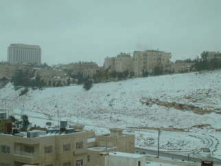 一昨日の1月7日(月)から雪が降っていて今10cm程積もっています。アンマンは坂が多いのと、普通のタイヤしかないので雪の日は自動車は運転が不可能です。そのため今日は全ての会社は休みです。何年か前には40cm程積もったことがあったそうですが、今回の降り具合を見るとここ砂漠の国ジョルダンでもそれ位積ることがあることを納得しました。 |