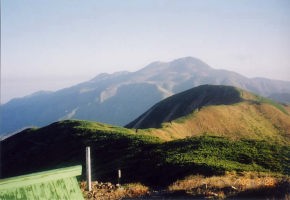 神鳩避難小屋には予定よりもかなり早く到着した。12人ぐらいは泊まれそうな綺麗な小屋だ。暑かったので小屋の前のベンチで着替えつつ休む。ここで二人組の登山者に抜かされた。十分ほど休み、避難小屋の前にある神鳩ノ宮跡の祠に手を合わせてから出発した。樹林帯はまだ少し続くが、やがて疎らとなり笹が目立って来る。背後に麓の景色が再び見えるようになると母御岩に到着した。岩の上に乗ると麓の景色はさらに良く見える。ここで先程の二人組みを含めて八人くらいを抜かした。長話をしていて知り合い同士のようだった。そこから少し登るとなだらかな笹原を歩くようになった。しかしガスが次々と流れてきて視界が悪くほとんど前が見えない状態になって来た。横風が強く、冷たいので合羽を着なければならなかった。やがて登山道は登りとなり銚子ヶ峰の山頂に到着した。予定ではここで昼食のはずだったが、参考にしたエアリアのコースタイムよりも二時間も早く着いてしまったので全くそんな気分にはならなかった。あまり早く三ノ峰の避難小屋に着いてもつまらないのでここでガスが流れるのを待つ。うまくいけば景色が得られ、先程の登山者に写真も撮ってもらえるはずだ。山頂にいた三十分程の間にガスはだいぶ上がって二ノ峰から下が見えるぐらいまで回復。そしてもちろん写真を撮ってもらう事も出来た。彼らは銚子ヶ峰までとのことだった。一人縦走路を北へ向かう。