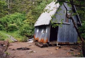 歩き始めてすぐに鳥居が現れる。開田口は御嶽教とあんまり縁がないのかと思っていたけど、そうでもないらしい。三ノ池にも近いしな、とか思いながら先へ進む。林の中の湿った道を沢沿いに歩いてゆくと五合目だ。少し歩くとちょっとした登りになり、尾根に出る。道が乾いているだけでだいぶ歩きやすくなった。何回か倒木を乗り越える。しばらくだらだらした登りが続く。突然開けた場所に出たと思ったら七合目の避難小屋があった。すでに床は落ち、倒壊寸前だ。小屋の前で昼食をとる。ここは割とスペースがあるので休憩にはちょうど良いところだ。