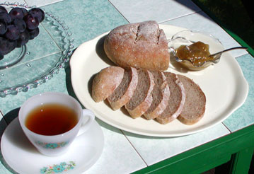 クルミやレーズンがたっぷり入った全粒粉やライ麦などの素朴なパンが好きで、時間があれば自家製の天然酵母でカントリースタイルのパンを焼いています。 天然酵母を使ったパンの発酵には、果物などに付着する酵母菌を抽出・培養したパン種を用います。天然酵母の抽出には、果物以外に野菜や草花なども利用できるようですが(極端な話、酵母菌が付着しているものなら何でも利用可能で、サンフランシスコ名物のサワーブレッドなどに用いるサワー種は、もとは空気中の酵母菌を培養するようです)、この地域は巨峰の産地で新鮮なものが手に入るため、去年は巨峰から抽出した酵母でパン種を作りました。巨峰で作ったパン種は発酵力が強く、香りのよい美味しいパンが焼けます。 今年も9月に入って巨峰の出荷が始まり、知り合いから頂いた初物を少し残して早速パン種を作り、カンパーニュを焼きました。風味豊かな天然酵母のパンにはサッパリとした甘みの自家製ルバーブ・ジャムがよく合います。 天然酵母を使ったパン作りは奥が深く、時間と手間もかかりますが、その分焼きあがったパンは味わい深いものとなります。 |