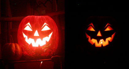 今月末は万聖節(11月1日)の前夜祭(10月31日)のハロウィーンです。 今年は直径40cm程度の小ぶりなカボチャを手に入れてジャック・オ・ランタンを作ってみました。中にライトを入れるとなかなかそれらしいお化けカボチャが出来上がりました。 |