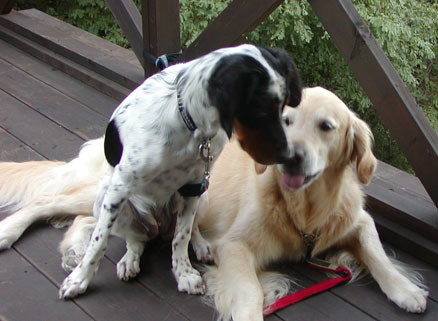 このCountry Comfortがしばらくお休みしていた間に家族が増えました。 イングリッシュ・セターは以前から飼いたかった犬種ですが、ノワとは4ヶ月ほど前に偶然出会い、その日のうちに親犬の飼い主さんから譲り受けました。彼女は両親が現役の狩猟犬のせいかものすごく活発で気が強く、体の大きなナッツもタジタジでジャレあっても決して負けません。そのイタズラも大変なもので、口にした物はほとんど何でもかみ壊してしまいます。メス犬は飼いやすいと思っていたのは大間違い。 |