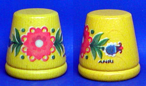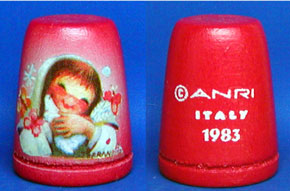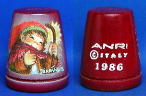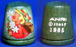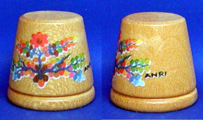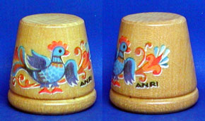 | ANRI thimbles イタリアの木彫メーカーANRI社(1912年設立 )は現在美しい木彫りの人形で世界中に知られていますが、1980年代を中心にウッドシンブルを作っていました。これらの可愛らしいウッドシンブルを集めました。 なお、創業から1960年代までは現在とは異なり、素朴でユーモラスなデザインのキッチン・バー用品、文房具などさまざまな種類の木彫製品をアメリカを中心に輸出していました。これらは現在Old ANRI(下の映像)と呼ばれ、世界中に熱心なコレクターがいます。Koong_shee's ThimbleでもOld ANRIの一部をコレクションしていますのでご興味のある方はお問い合わせください。 |
