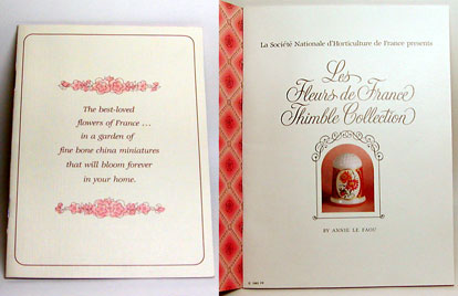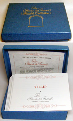 | フランクリン・ミント・コレクション 10 フランスの花・シンブル Les Fleurs de FranceThimble Collection 1983年に発売されたLes Fleurs de France Thimble Collection, フランス国立園芸協会(SNHF)監修によるフランスで愛されている花のシンブル全25種類です。 この商品には、コレクションの解説書及びそれぞれのシンブルを説明したリーフレット25冊が付属します。 |