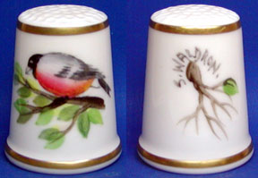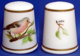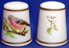 250年以上の歴史を持ち、イギリスを代表する陶磁器メーカーのRoyal Worceterは、シンブルの生産でも100年以上の歴史があり、特に初期(19世紀後半〜20世紀前半)のハンドペイント(手書き)・シンブルは大変希少でコレクターの間で高値で取引されています。 陶磁器シンブルのコレクションは欧米では1970年代から80年代にかけて盛んになり、大量に同一のデザインのシンブルを生産する必要からRoyal Worceter でも1974年にデカール(転写紙)・シンブルの生産をスタートしました。その後もハンドペイント・シンブルの生産は続けられましたが、1985年にその生産が打ち切られました。 Royal Worceterのハンドペイント・シンブルはごく初期のものを除き、表側に鳥、花、果物などの絵柄が、裏側にペインターのサインが描かれています。ここにご紹介したシンブルはRoyal Worceterのハンドペイント・シンブルとしては最後の時期(1970年代から80年代)に作られたものですが、伝統的な絵柄が繊細に描かれており、また同じモチーフでもペインターによって微妙に絵柄が異なるなど、ハンドペイントの味わいがうかがえます。なお、これらのシンブルのペインターは全て女性ですが、同じペインターでも結婚で姓が変わる場合もあります(初期には男性のペインターが多かったようですが、後期になるほど女性が多く占めるようになったようです。また、Royal WorceterのHPでは、一人前のペインターになるのに7年間のトレーニングが必要とのことで、なかなか過酷な作業のようです)。 Royal Worceterのハンドペイント・シンブルは、海外では最も重要なコレクション・アイテムのひとつと考えられています。不思議なことに日本ではあまり高い評価は得られていないようですが、Royal Worceterの伝統と格式を凝縮したハンドペイント・シンブルは陶磁器シンブルのコレクションには欠くことのできないもので、Royal Worceterがハンドペイント・シンブルの生産を中止してからすでに20年以上が経過しており、今後更に評価が高まるものと思われます。 |