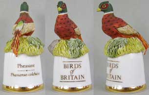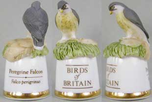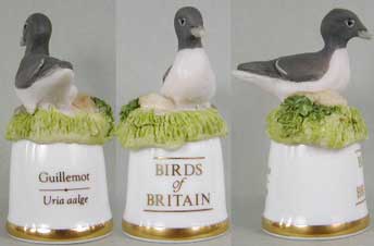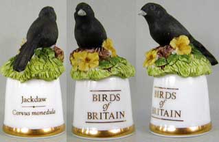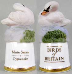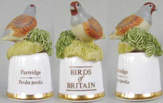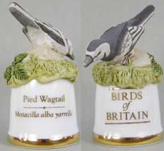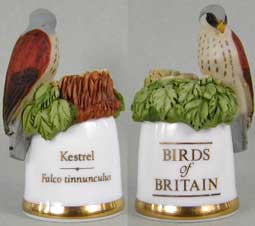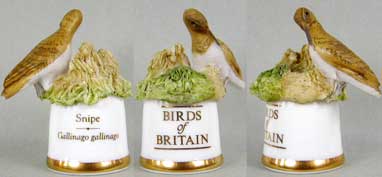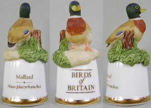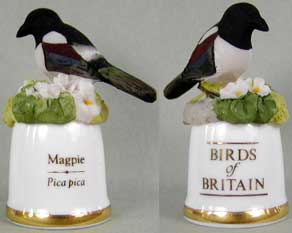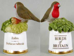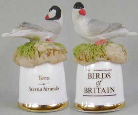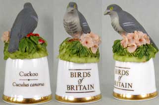 | 「英国の鳥」 ユニークなデザインのシンブルで人気のサザーランド(イギリス)が製作した「英国の鳥」シリーズです。シンブルの裏面には鳥の英名(英国名)と学名が書かれています。 |