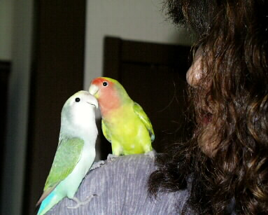 あーあ、しょうがないよなぁ・・・。 んでも可愛いから良しとするか! たろちゃんには、自宅に帰るとのんちゃんというお相手がいます。 ただしのんちゃんは女の子(笑)。 たろちゃん:「のーん♪」 のんちゃん:「ちゃん♪」 ・・・と、鳴き交わすことが日課だそうな。 たろちゃんは、沢山のコザクラの中、相棒のんちゃんを探していたようで、 こまに向かって盛んに「のーん」「のーん」と呼びかけます。 訳の分からないこまちゃんには、たろちゃんからの呼びかけに応えようもなく、 しかし何かをしてあげなきゃならない!とは考えたようで、のんちゃんの 毛繕いを始めました。 ・・・・・が! さすがLovebird、仲の睦まじいことよ、と眺めていたのも束の間。 この後こまは、たろちゃんに足を咬まれてしまうのでした。 どうやらのんちゃんではないことがバレたようです。 大事に至るほどの咬み方ではなかったけれど、こまがギャッ!と鳴いて飛 び退いた時は、私も正直焦ってしまいました。 ふぅ・・・・、やはり相性は大事。 たろちゃんにとっては、きっと何処の誰よりも、のんちゃんが一番大切なお相 手なのネ。 |