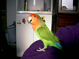 Qちゃんは通算32個の卵を産んだ(残念ながら抱卵しない)という貫禄タップリの小桜女王。 ホスト宅F家の中心人物(鳥物か)です。 その体重は多い時でなんと57g! 我が家のこまちゃんなんて、足元にも及ばない健康優良児ぶりを見せ付けてくれました。 元々多種飼いのお宅なので自分と違うコの存在にも慣れてはいるけれど、 黒髪インコのぱんたちゃんやオカメインコのバジルちゃんがケージの側を歩いた時には、 「我が領土を侵略する不埒な敵!」 とばかりに、水入れをガッタンゴットン揺さ振り、お怒りを露になさいました。(笑) (ゴメンネー、女王様の存在をないがしろにしているわけじゃないのですぅ〜) |