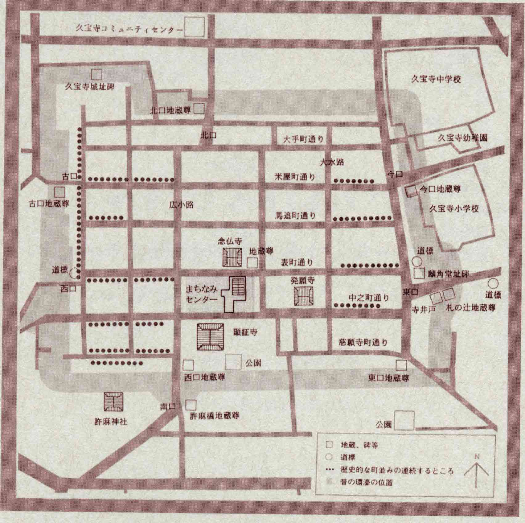 | 久宝寺寺内町の歴史は、450年以上前、戦国時代にまでさかのぼります。文明2年(1470年)に本願寺第8世蓮如上人が久宝寺で布教した際、「帰する者市の如し」といわれるほど帰依する者が多かったので、文明11年(1479年)この地に西証寺を建立しました。後に西証寺は顕証寺と寺号を改め、天文10年(1541年)頃にこの御坊を中心として久宝寺寺内町が誕生しました。久宝寺は地理的に要衝の地にあり、中・南河内の門徒集団を束ねる拠点として多くの門徒集が集まり住むとともに、商工業者も集まって活発な商業活動が行われるようになりました。 江戸時代以降は、農村部における商業の中心−在郷町−として発展しました。久宝寺は旧大和川(現在の長瀬川)の船運の要衝として、また堺から八尾街道を経て京都に至る主要幹線の中継点として栄えました。しかし慶長年間に本願寺の東西分派にともなって久宝寺の一部の住人が分離独立して八尾寺内町を建設し、宝永元年(1704年)に大和川の付け替えが行われると、それ以降地域の中心は八尾寺内町に移っていったのです。 | |||||||